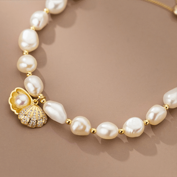 Plongez dans un univers de charme marin avec notre bracelet coquillage et perles baroques. Confectionné en argent sterling 925 véritable, ce bracelet allie à la perfection luxe et beauté naturelle. Son design raffiné se compose d'une chaîne délicate ornée de perles baroques brillantes et d'un charm coquillage scintillant orné de zircons.