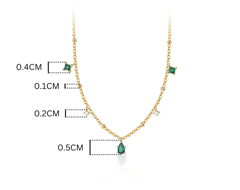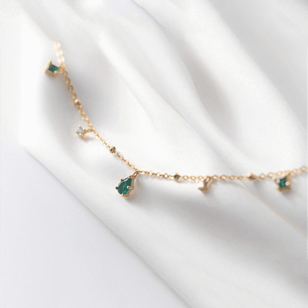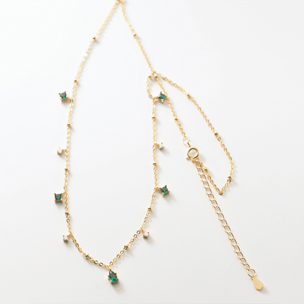 Au cœur du collier se trouve un zircon vert émeraude éclatant, d'une brillance et d'une élégance incomparables. Autour de la pièce maîtresse, quatre zircons verts plus petits créent un équilibre harmonieux et intensifient l'allure générale du modèle. De plus, la chaîne est ornée de minuscules perles, sublimant la composition complexe du collier. Quatre délicats zircons blancs, stratégiquement placés, complètent cet ensemble fascinant pour une touche d'éclat exquise. Ce collier témoigne d'un savoir-faire artisanal exceptionnel, alliant la richesse des zircons verts à la beauté délicate des zircons blancs et à l'élégance subtile des détails en perles.
