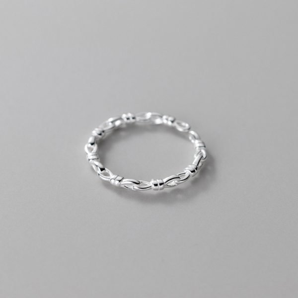 Réalisée avec une attention méticuleuse aux détails, l'anneau de la bague présente de jolis nœuds reliés entre eux, créant un look élégant et sophistiqué. La finition lisse et polie de l'argent sterling rehausse l'attrait du modèle et lui confère une touche d'élégance intemporelle.