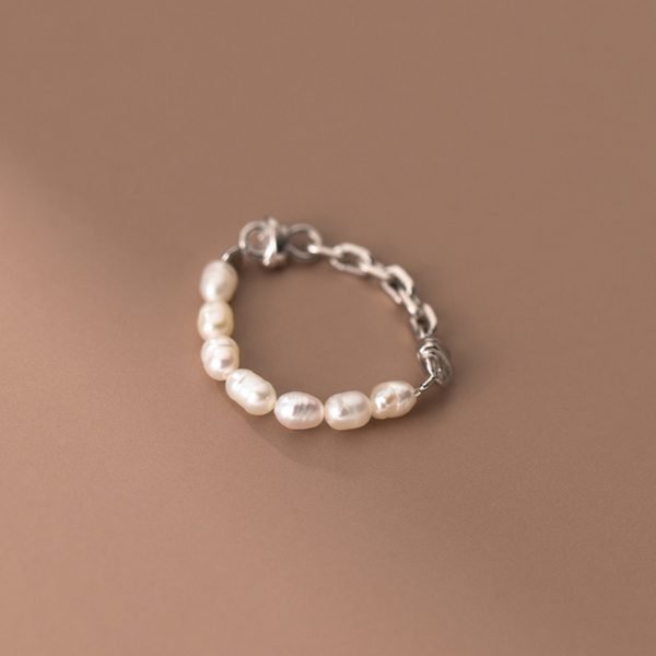 Fabriquée en argent sterling 925 véritable, cette bague allie durabilité et éclat luxueux. Que vous participiez à un événement spécial, célébriez un événement important ou souhaitiez simplement ajouter une touche d'élégance à votre look quotidien, la bague Pearl Elegance Chain Band est le choix idéal.
