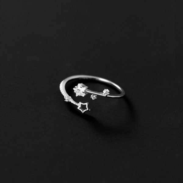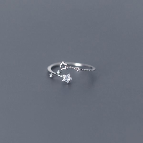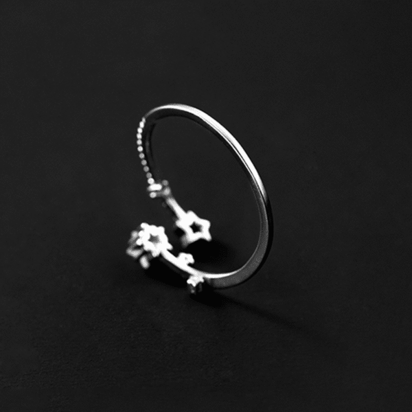 La bague met en valeur un groupe d'étoiles, chacune finement ornée de zircons scintillants. Les étoiles créent un motif d'inspiration céleste qui évoque l'émerveillement et la magie. Parmi les étoiles, une étoile creuse ajoute une touche unique à l'ensemble.